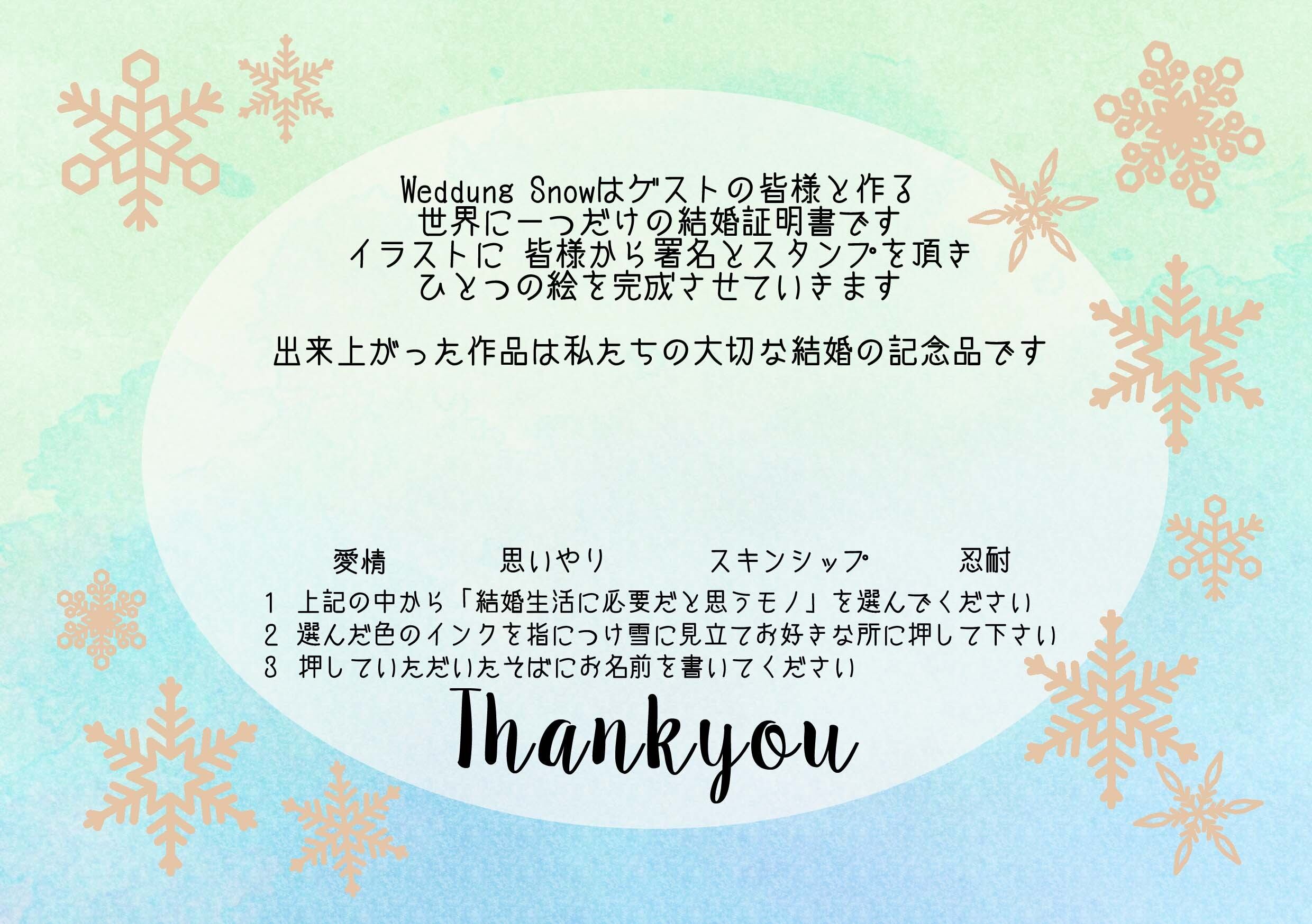 雪に見立てたゲストの拇印が新郎新婦を包みます。スノーボードがご趣味のカップルにおすすめ♪